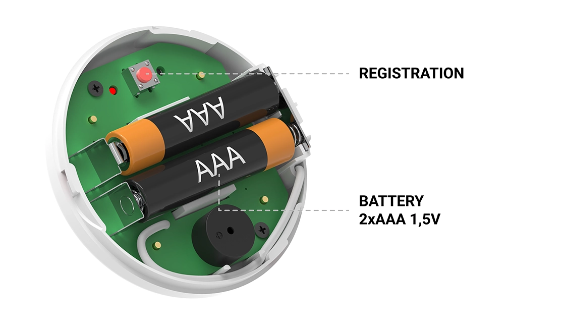 Registrierung - Die im Inneren des Geräts befindliche Taste dient zur Registrierung im System. Durch Drücken der Taste wird der Kopplungsvorgang mit der Zentrale gestartet.