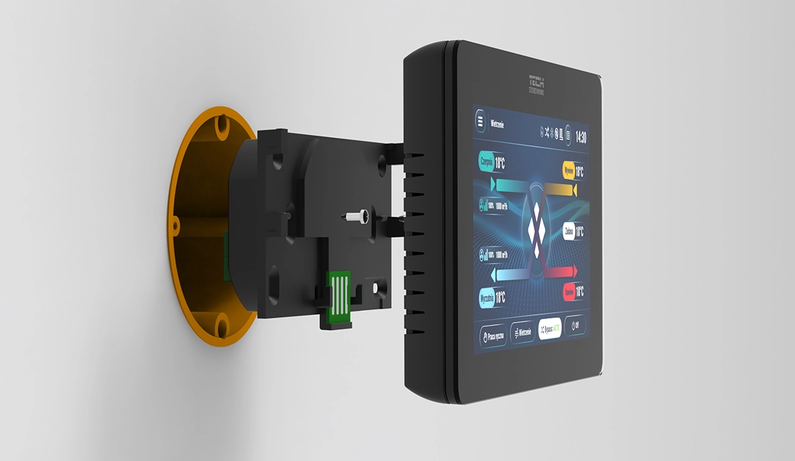 Das ADVANCE-Einbau-Bedienpanel wird so installiert, dass der Installationskörper in der Unterputzdose sitzt, während die Front des Geräts außen bleibt und eine moderne, elegante Bedienoberfläche bildet. Diese Lösung ermöglicht eine schnelle und saubere Montage, und das Panel präsentiert sich an der Wand ästhetisch, ohne sichtbare Kabel oder zusätzliche Elemente.