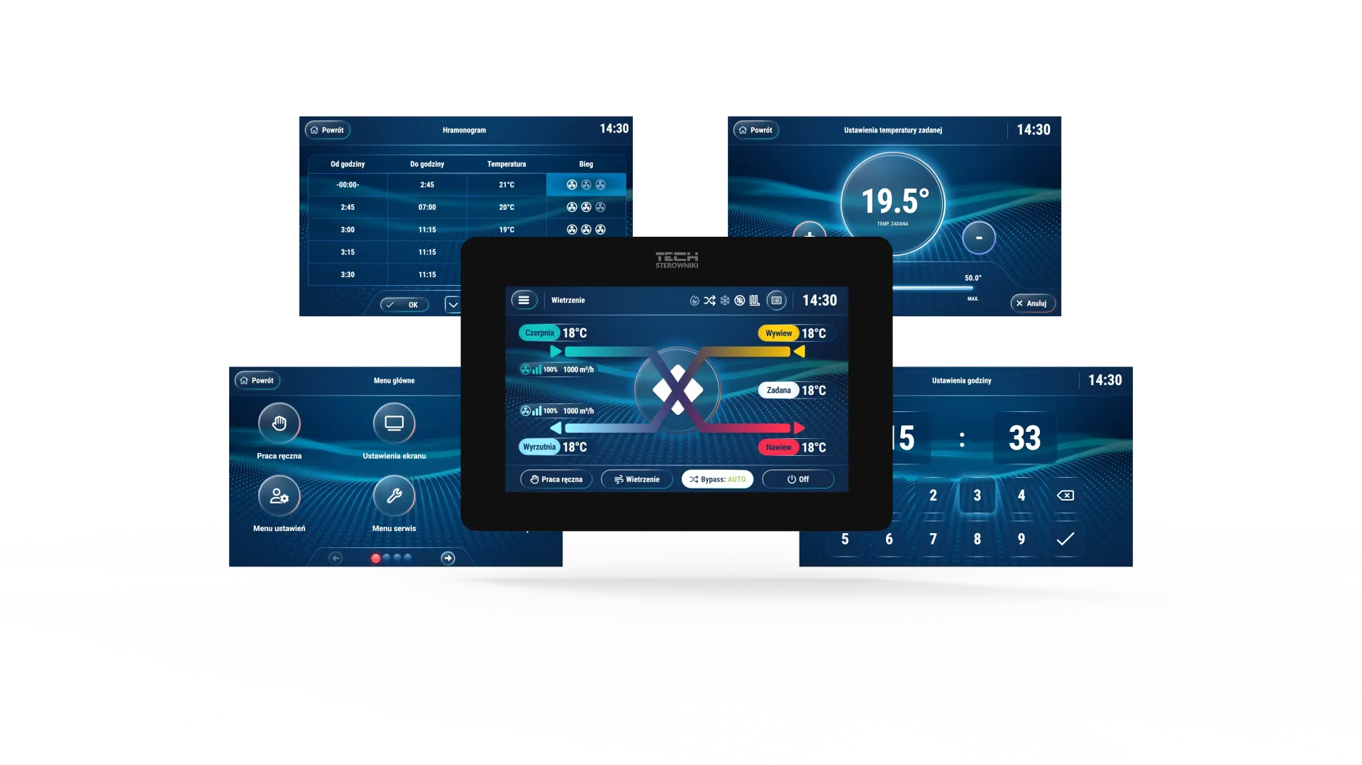 Das System ist für die umfassende Steuerung der Lüftung in Wohn- und Gewerbegebäuden konzipiert. Dank des fortschrittlichen Reglers ist eine präzise Steuerung von Zu- und Abluft, Temperaturkontrolle, Zeitplanverwaltung und Filterstatusüberwachung möglich. Das Set bietet eine vollständige Integration in die Lüftungsanlage, erhöht die Energieeffizienz des Gebäudes und steigert den Benutzerkomfort.