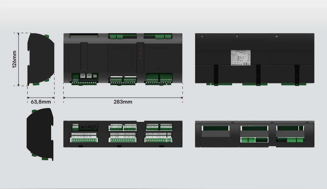 Das Ausführungsmodul wurde so gestaltet, dass es bequem in Standard-Elektroschränken untergebracht werden kann. Dank durchdachter Konstruktion und Proportionen passt das Gerät perfekt auf eine DIN-Schiene und gewährleistet nicht nur Funktionalität, sondern auch eine ästhetische und geordnete Anordnung der Installationskomponenten.