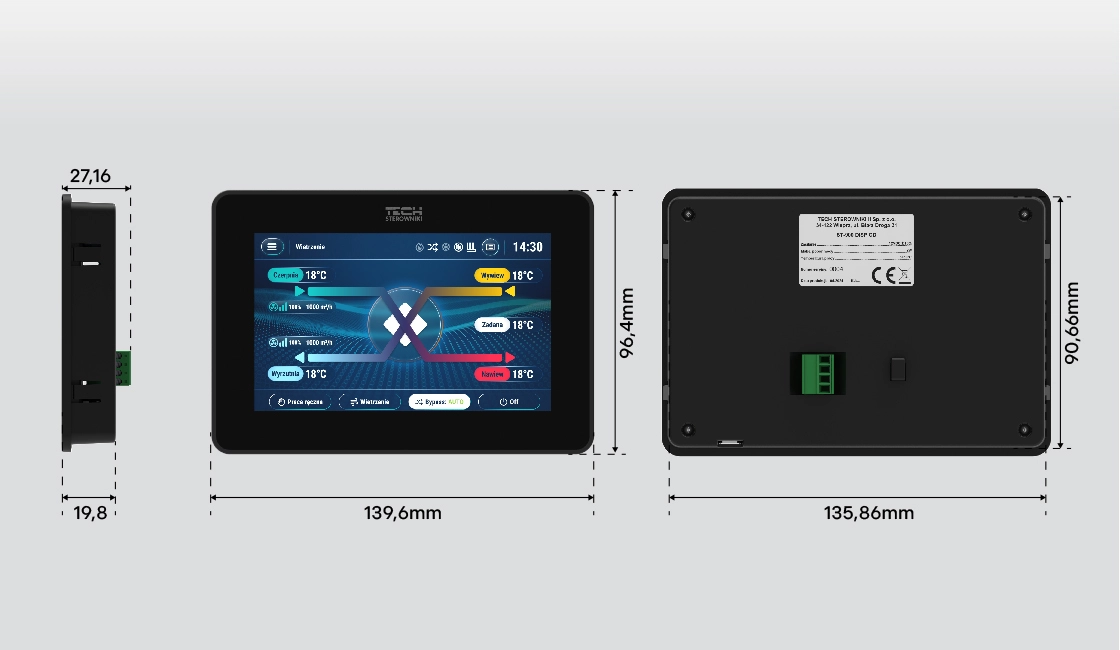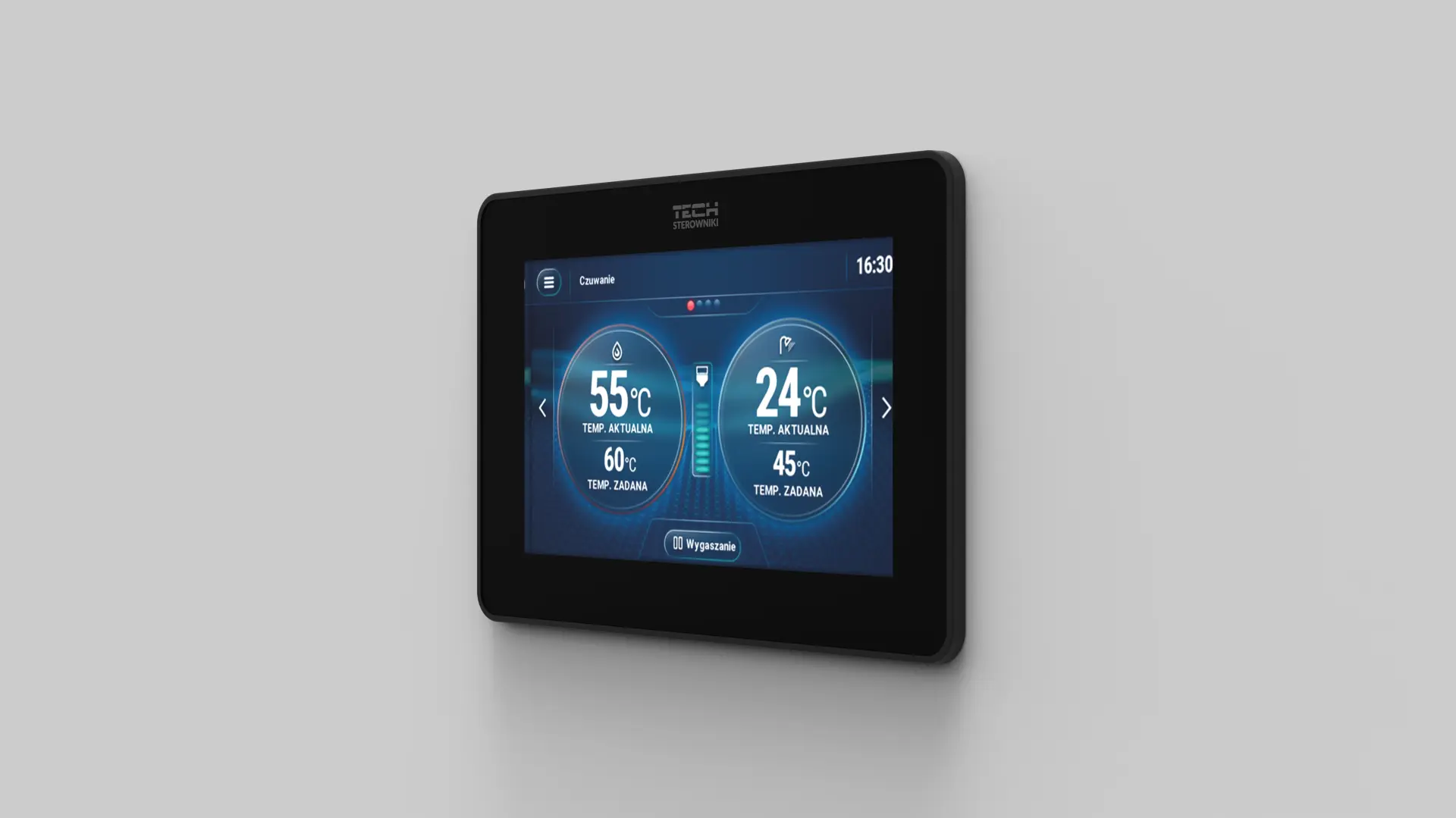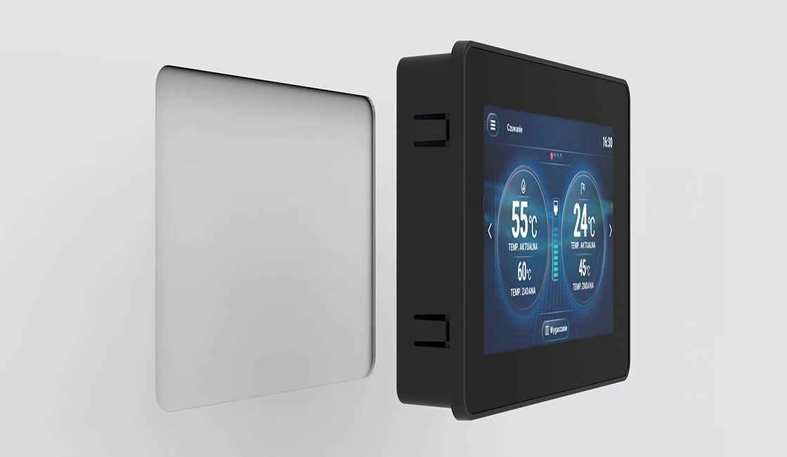 Die Unterputzversion des Bedienfelds wurde für eine einfache und schnelle Montage ohne Eingriff in die Wandstruktur entwickelt. Ausgestattet mit einem modernen 5'' TFT-Touchdisplay ermöglicht es eine intuitive Steuerung des gesamten Heizsystems.