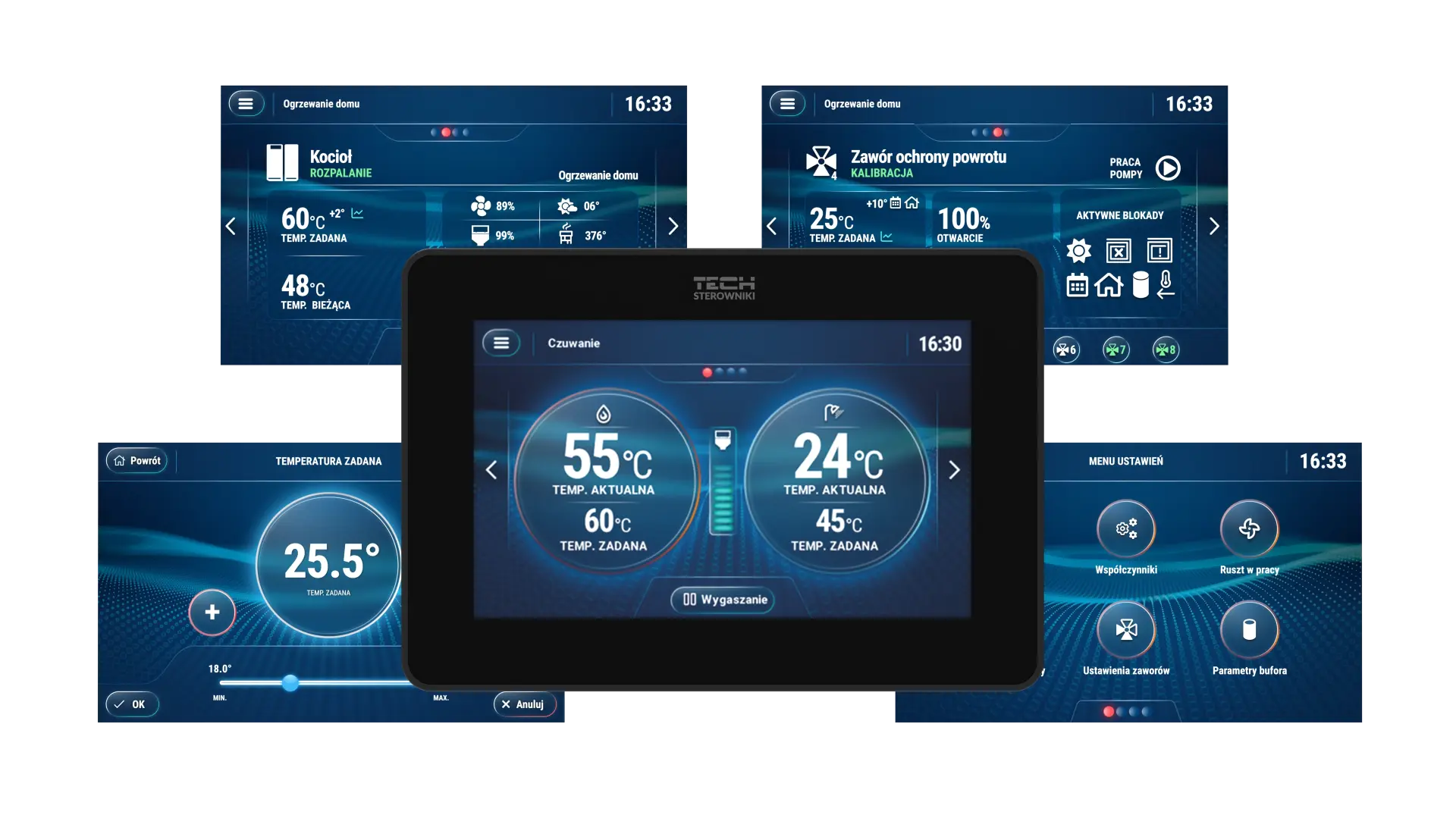 Zusätzlich stehen Ansichten für die einzelnen Installationsbereiche zur Verfügung – wie z. B. Heizungsbildschirm, Rücklaufschutzventil, Kesselsteuerung und Einstellungsbildschirm, auf dem die Systemparameter individuell angepasst werden können.