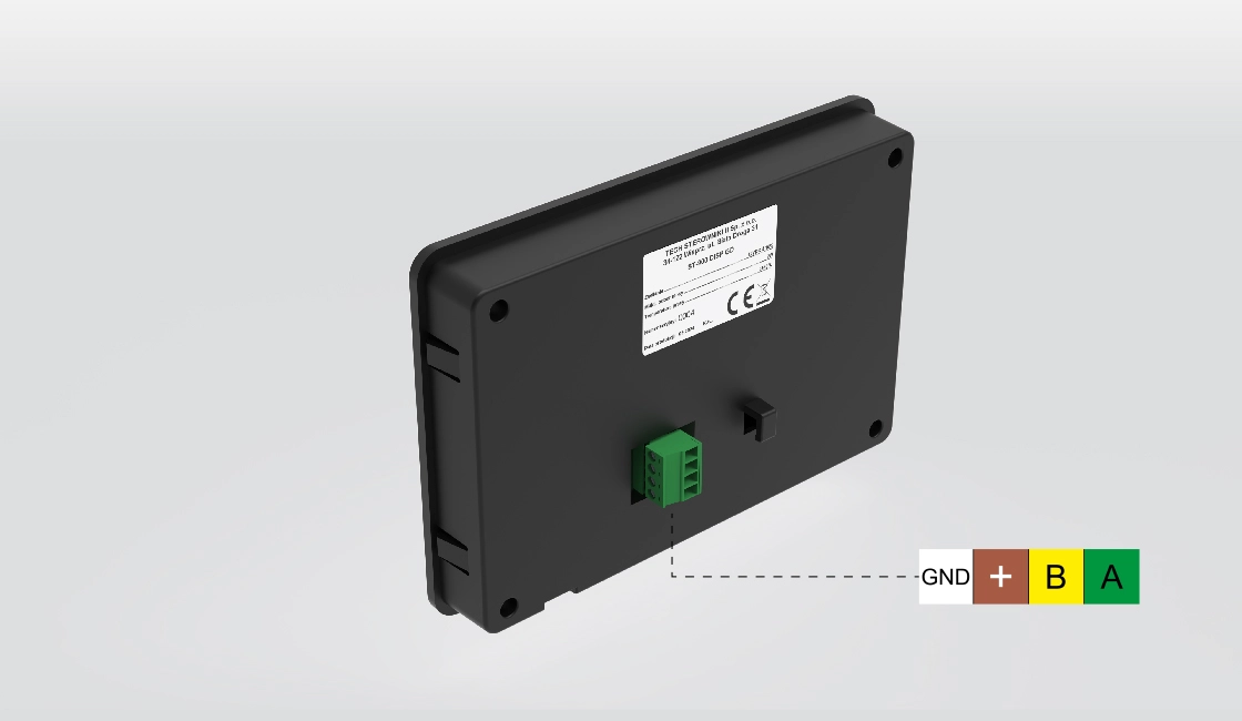 Das Bedienfeld kommuniziert über eine kabelgebundene RS-Verbindung mit dem Ausführungsmodul und gewährleistet so einen stabilen und schnellen Datenaustausch. Die Buchse befindet sich auf der Rückseite des Geräts, was eine einfache Kabelführung innerhalb der Wand ermöglicht. Für die Installation ist keine zusätzliche Stromversorgung erforderlich – Kommunikation und Stromversorgung erfolgen über eine gemeinsame Verbindung.
