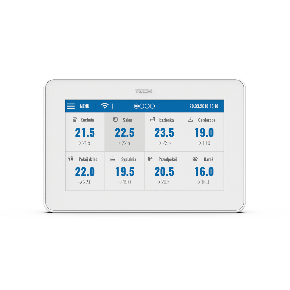 Das EU-M-12- Bediengerät ist das Hauptgerät. Damit lassen sich die Betriebsparameter der Heizung in bis zu 40 Zonen bequem steuern und bearbeiten. Mit Hilfe des Heizungssteuerungspanels können Betriebspläne bequem definiert und der gewünschte Temperaturwert separat eingestellt werden. Darüber hinaus können einzelne Zonen über das Bediengerät ein- und ausgeschaltet werden. Das Display des Panels bietet darüber hinaus weitere Optionen wie die Einstellung von Datum und Uhrzeit, Bildschirmschoner, Wecker und die Programmierung einer Bildschirmsperre.
