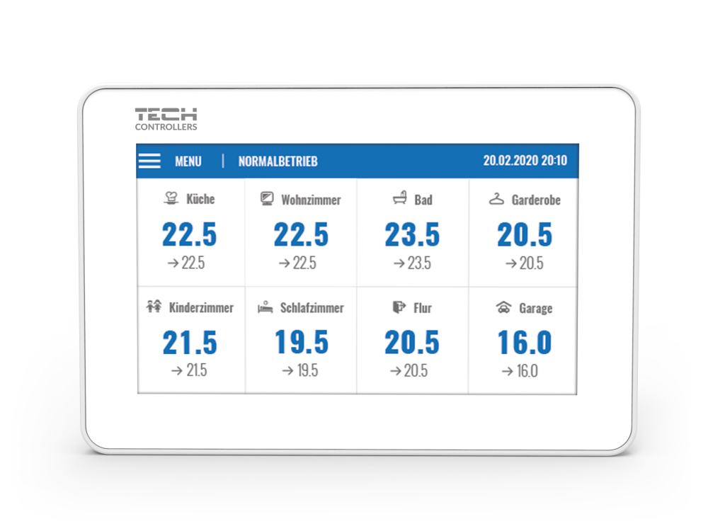 Änderung der Parameter für jede Zone (Einstellung von Zeitplänen, Soll-Temperatur), Möglichkeit, eine Zone ein- und auszuschalten, Einstellung von Datum und Uhrzeit im gesamten System, Einstellung der Display-Helligkeit, Bildschirmschoner, Bildschirmsperre. Eingebautes WiFi-Modul - Fernsteuerung über eModul-Anwendung.