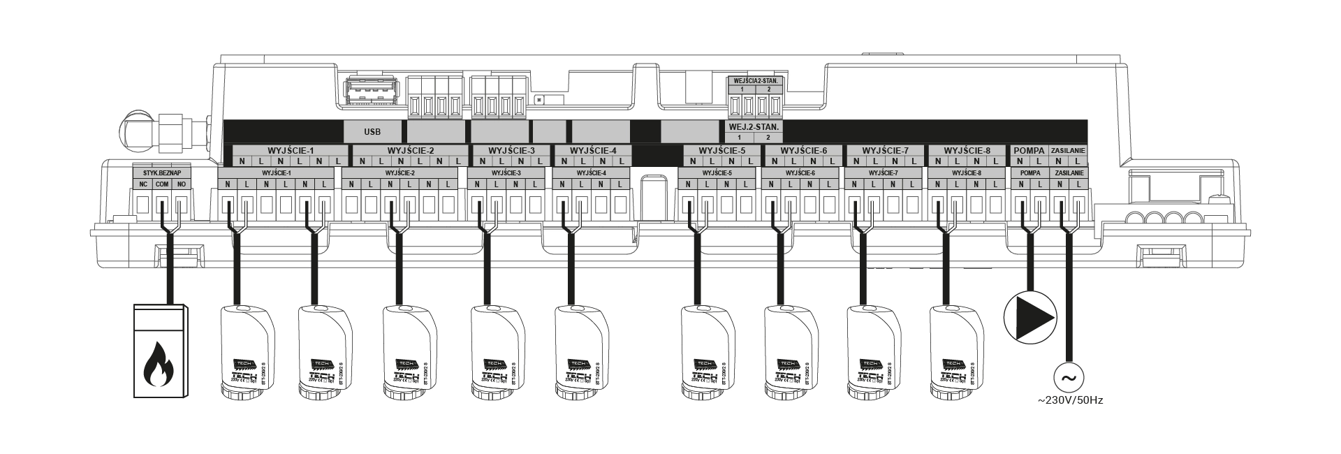 Jeder Ausgang ist separat programmierbar und kann daher sowohl für die Steuerung von Fußbodenheizungs-Stellantrieben als auch für die Ansteuerung von Umwälzpumpen genutzt werden. Im Fall des potenzialfreien Signals kann dieses als Steuersignal für das Heizgerät verwendet werden.
