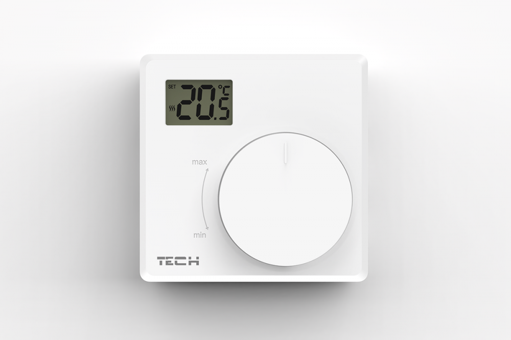Zweipunkt-Temperaturregler mit 230V-Versorgung und LCD-Display, ausgestattet mit einem Lufttemperatursensor. Die Einstellung der Soll-Raumtemperatur erfolgt über einen Drehknopf im Bereich von 5–30 °C. Umschaltmöglichkeit zwischen Heiz- und Kühlbetrieb sowie Einstellung der Hysterese über einen Schalter (0,5 oder 1 °C). Aufputzmontage.